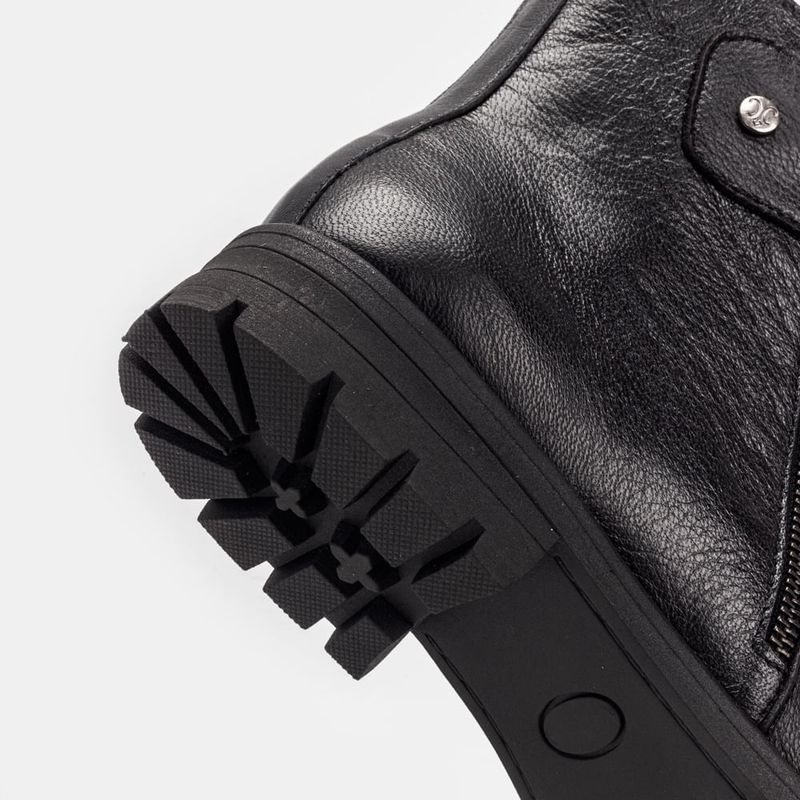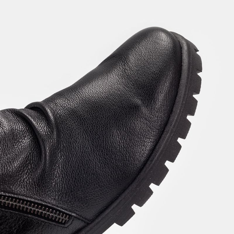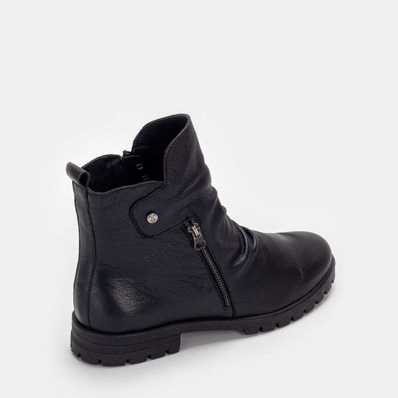 Bota com cano curto e recortado, salto baixo e blocado, bico redondo, puxador traseiro e zíperes lat...