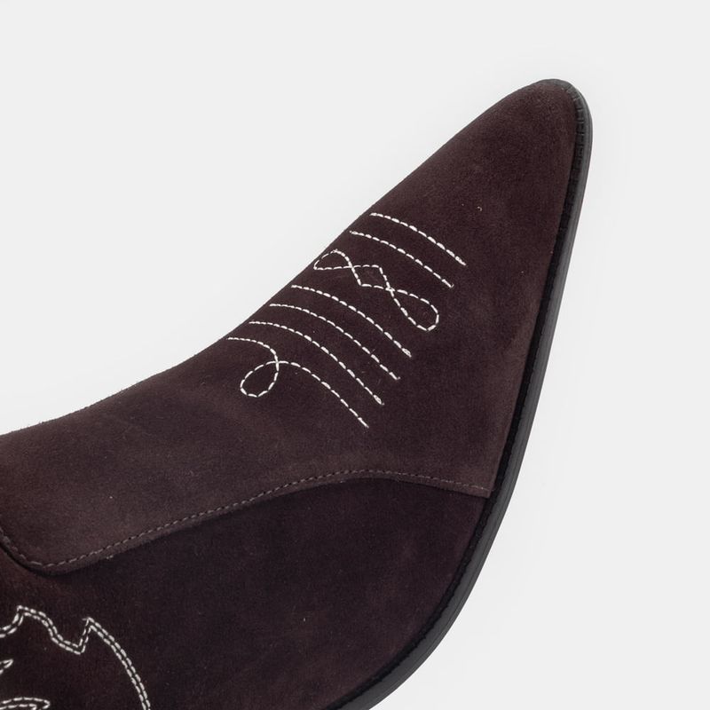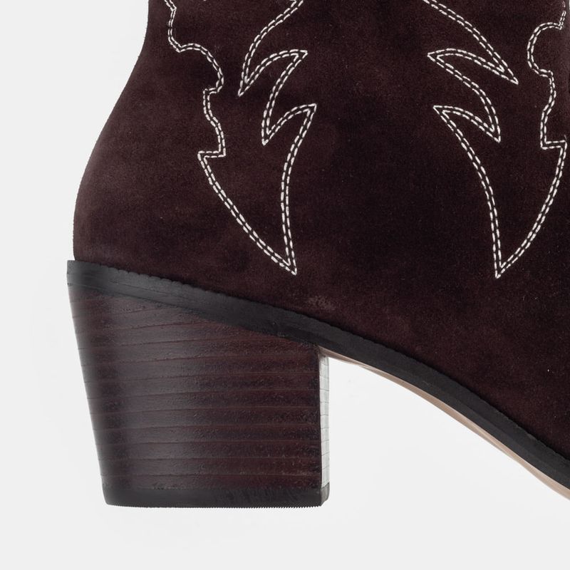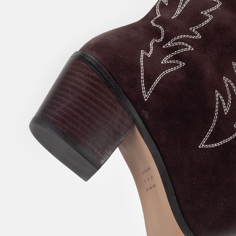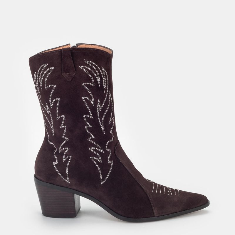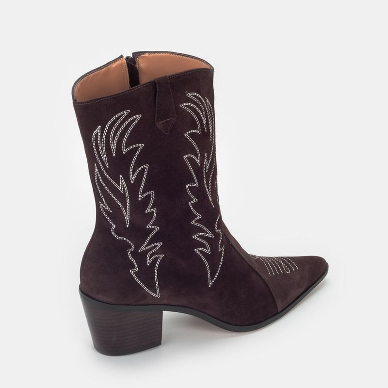 Bota com cano médio, salto blocado médio, bico fino e zíper na lateral interna Camurça marrom Salto ...