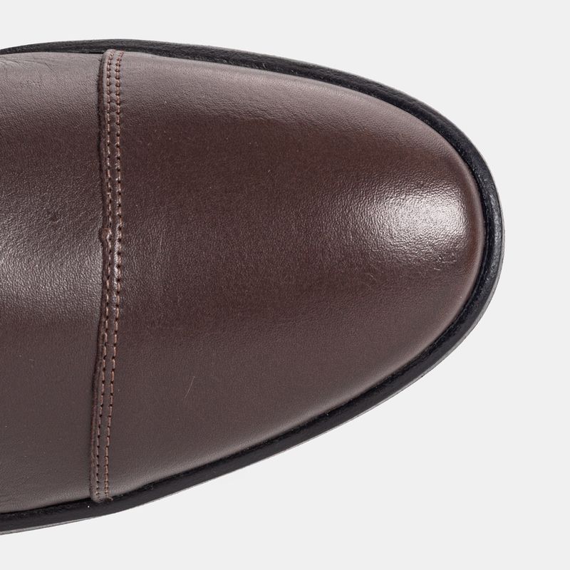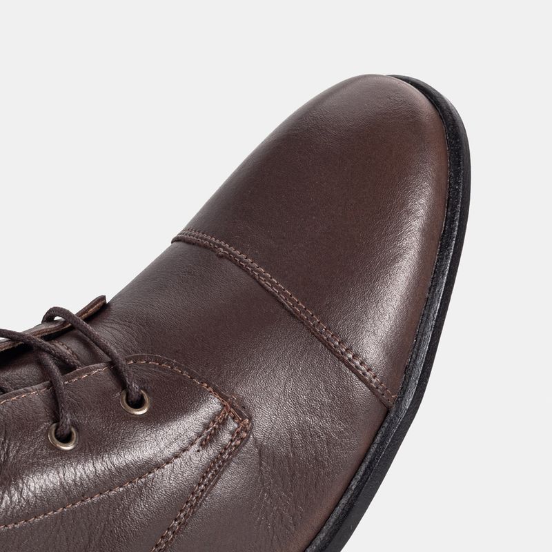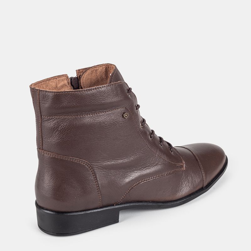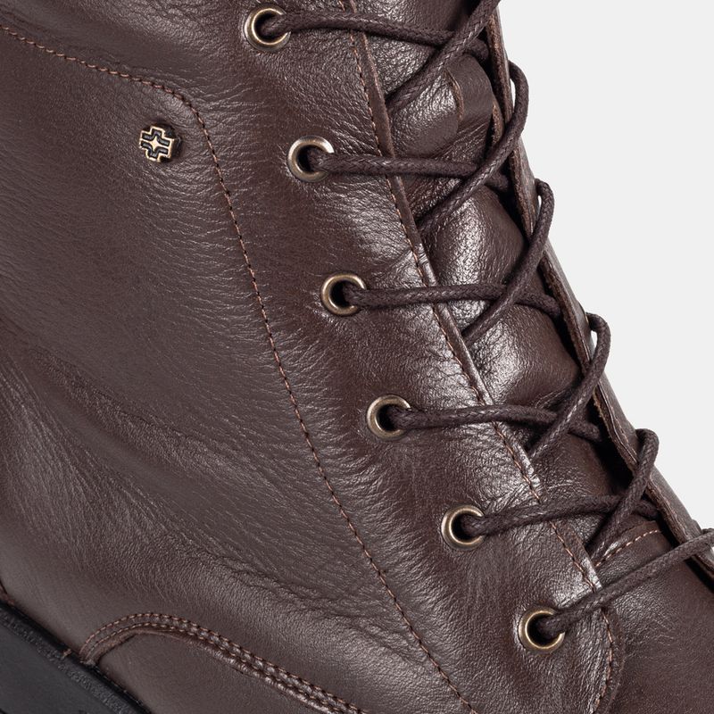Coturno salto baixo, zíper na lateral interna, bico redondo e fechamento em cadarço Couro marrom e ...
