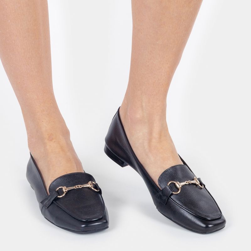 Mocassim com bico quadrado e fivela frontal dourada Mais informações