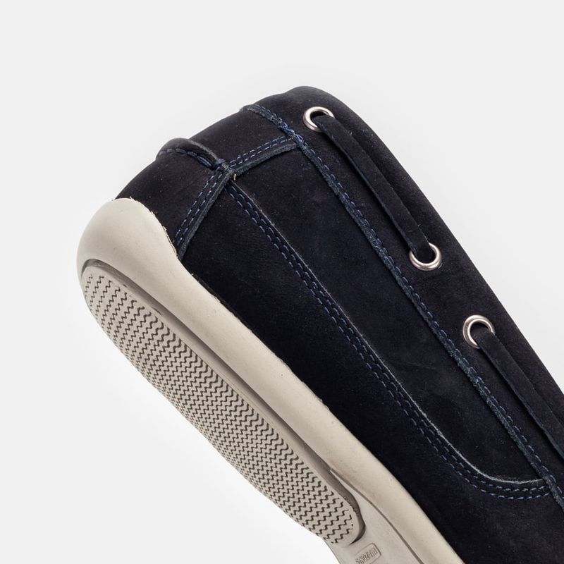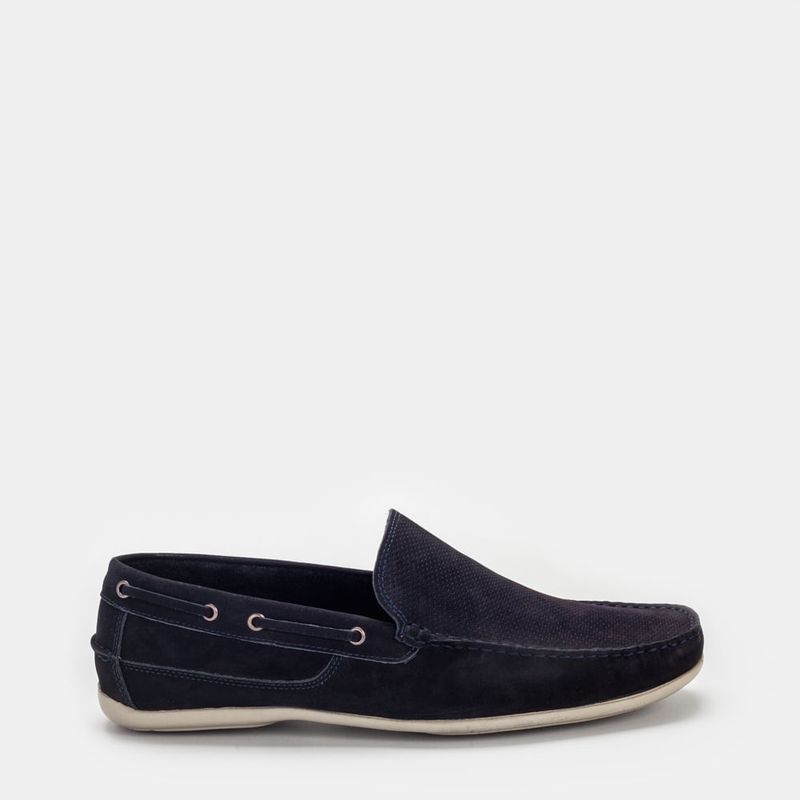 Mocassim com tira aplicada nas laterais e acabamento pespontado Nobuck texturizado marinho Palmilh...