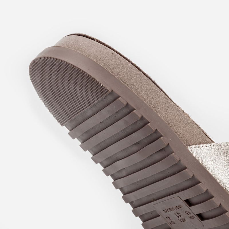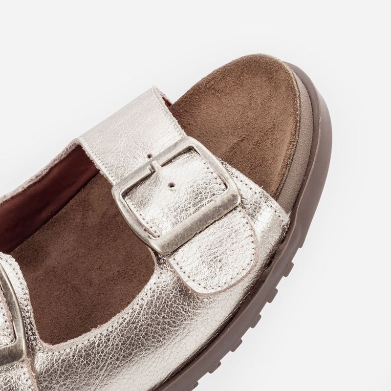 Chinelo estilo papete com tiras sobre o peito do pé ajustáveis em fivela Couro ouro Salto 2,5 cm ...
