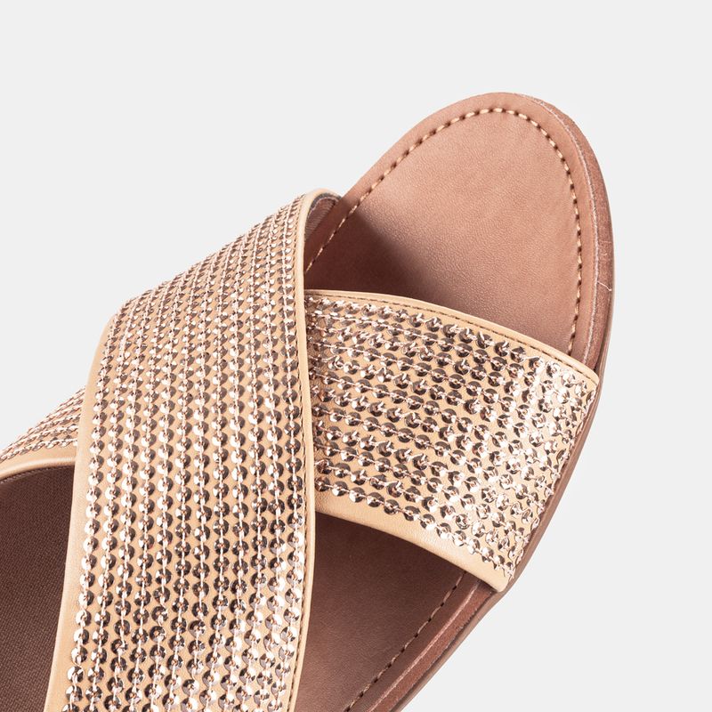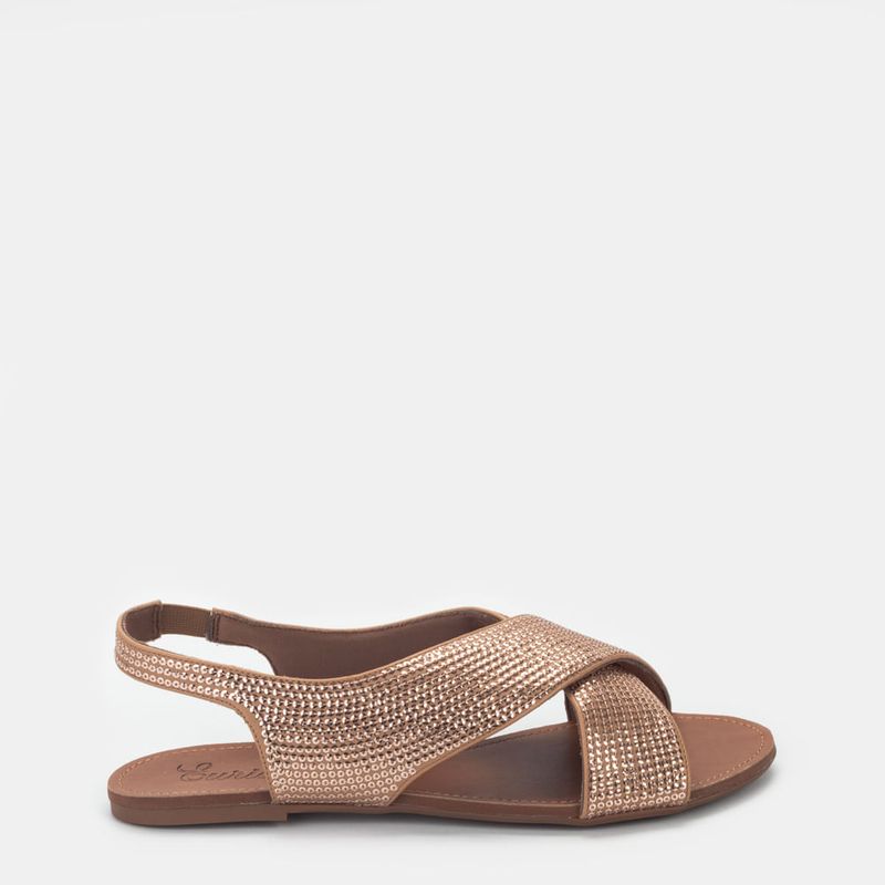 Rasteira com tiras largas cruzadas e fechamento traseiro com elástico Marrom Tiras com paetês ros...