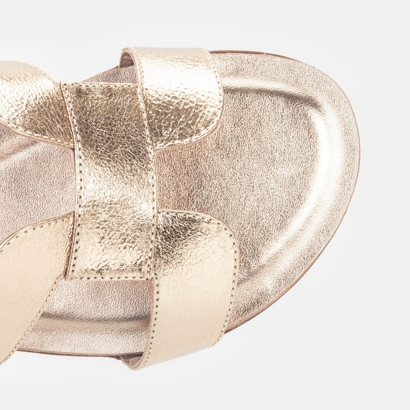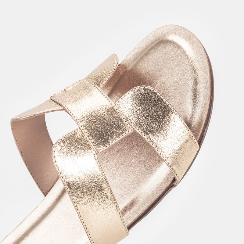 Rasteira bico quadrado, tira reta, flatform Couro ouro Palmilha forrada, acolchoada e macia Solad...