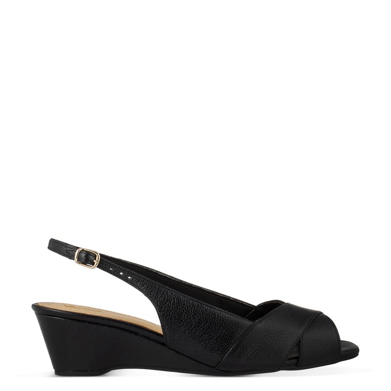 Sandália anabela peep toe com tira cruzada frontal Couro macio preto Salto 5 cm Tira traseira aju...
