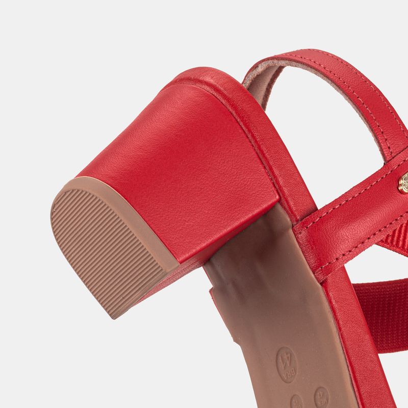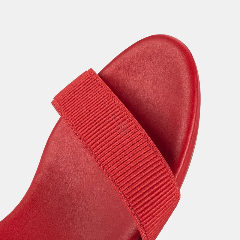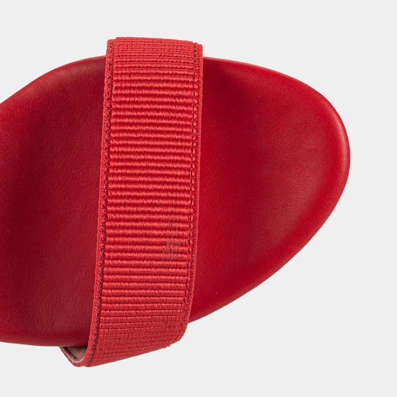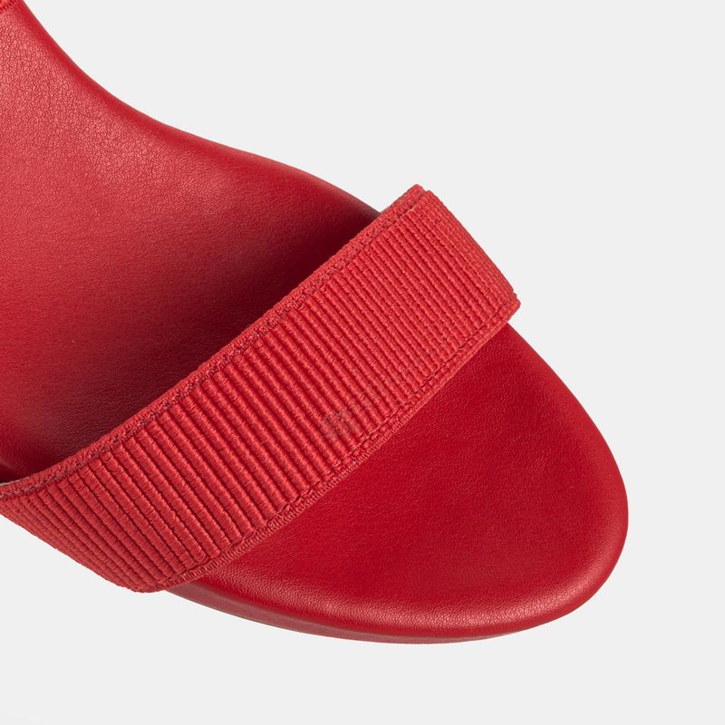 Sandália com salto médio, tira frontal única e tira do tornozelo elástica Couro e tecido vermelho ...