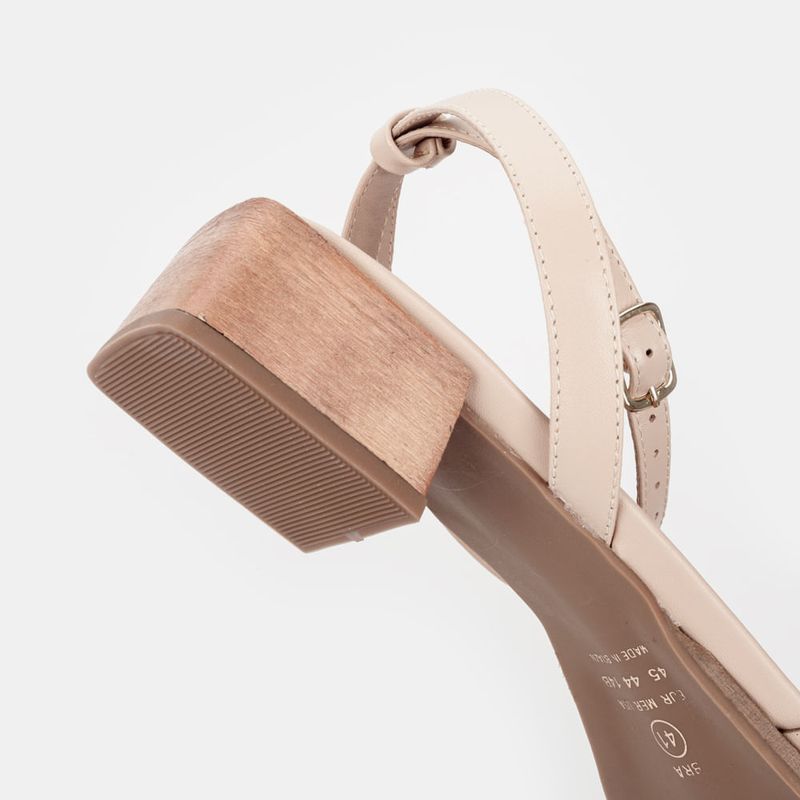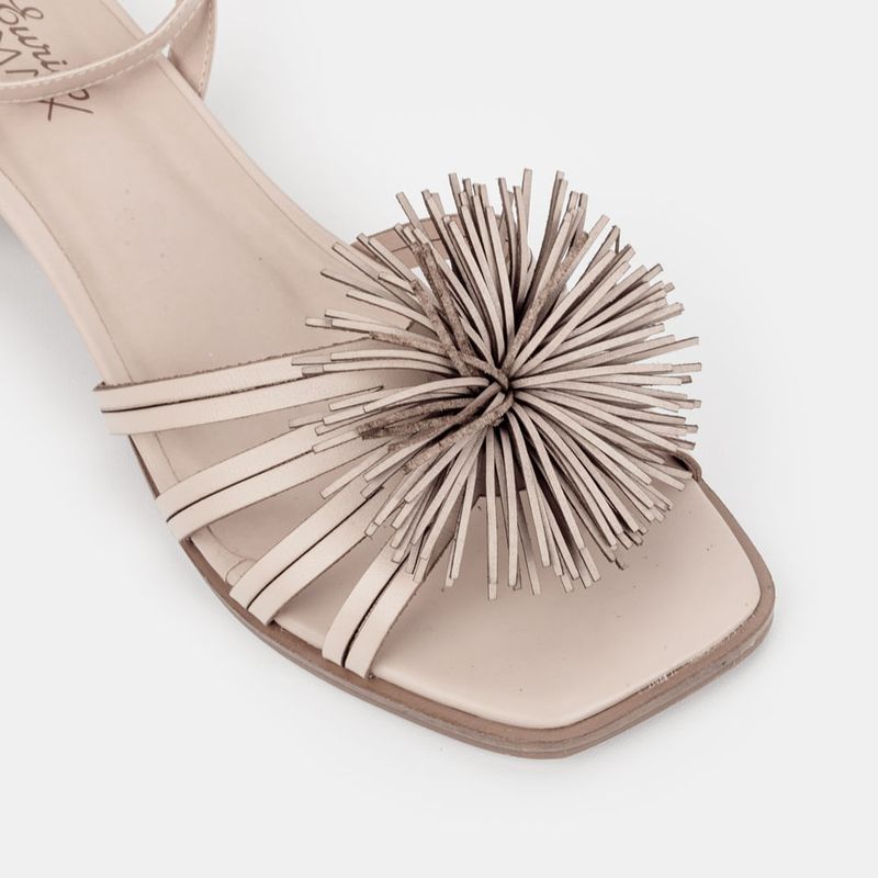 Sandália tira com enfeite, fechamento em fivela no tornozelo, salto blocado e bico quadrado Couro nu...