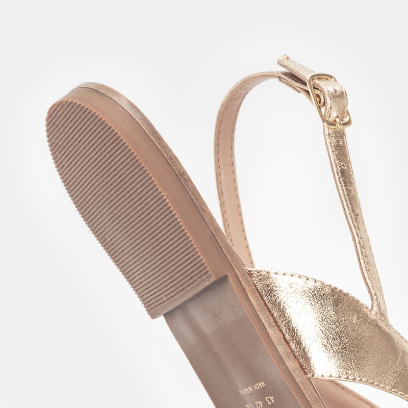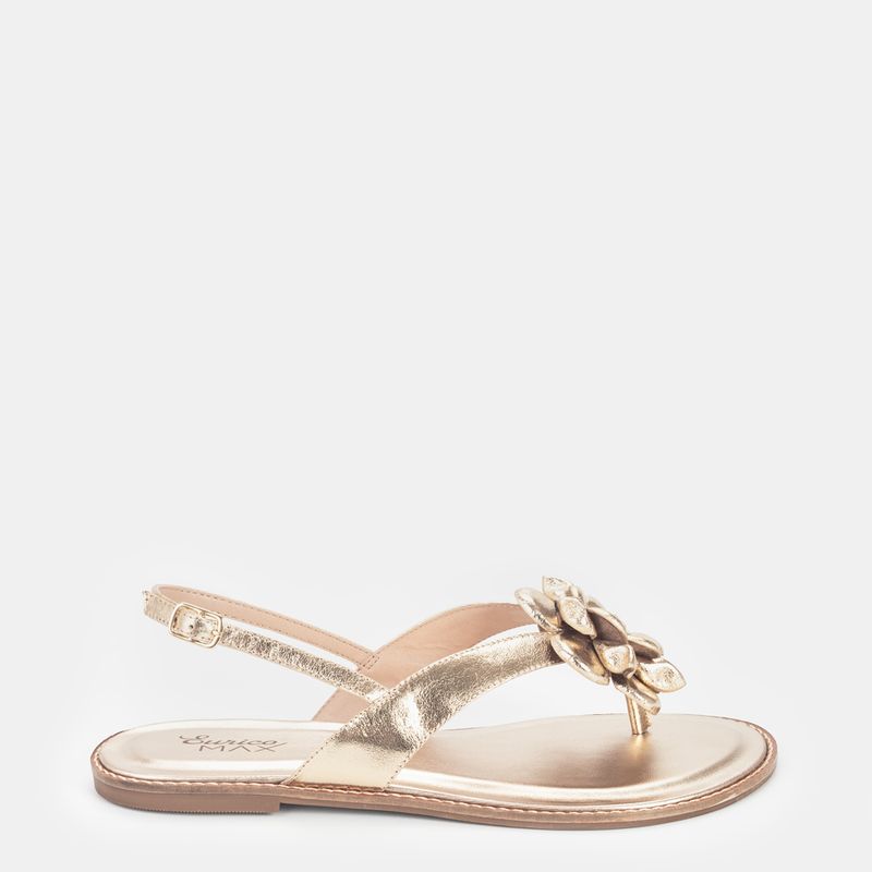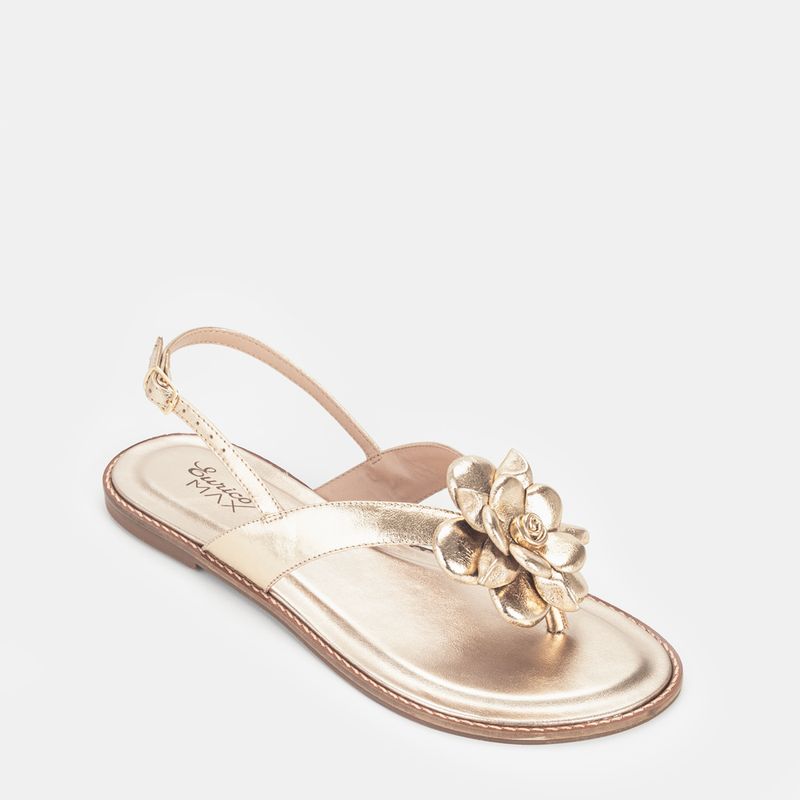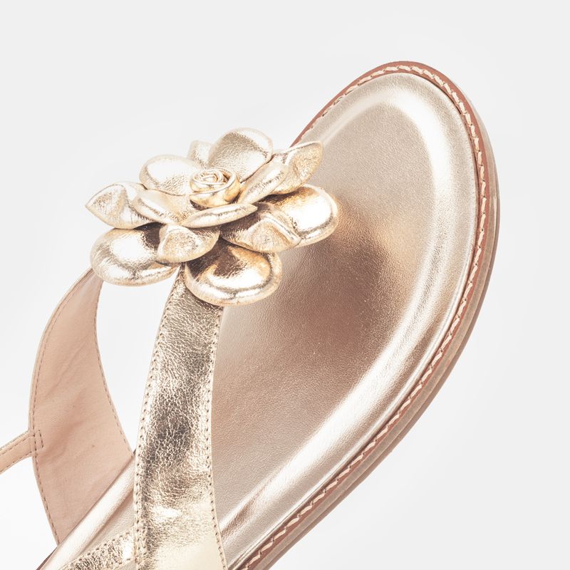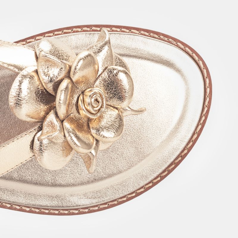 Sandália flat, bico redondo e detalhe de flor Couro ouro Palmilha forrada e macia Solado de borra...