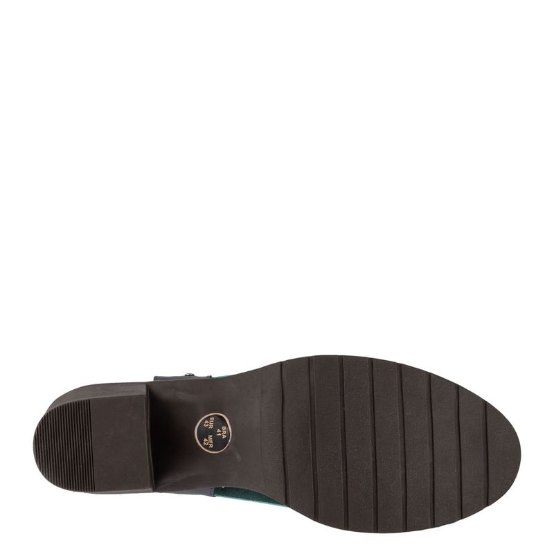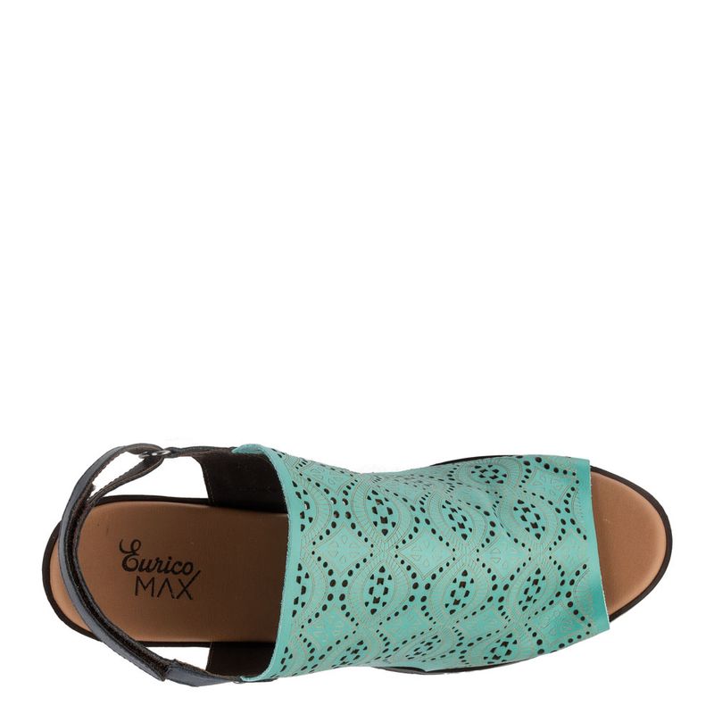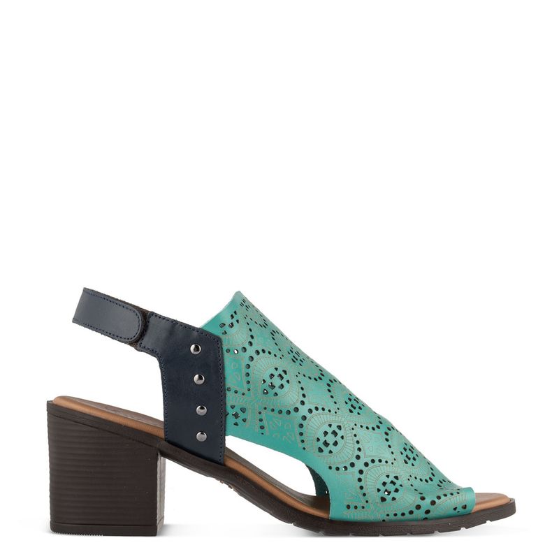Sandália salto blocado médio, bico redondo com recortes a laser e tira no calcanhar ajustável com ve...