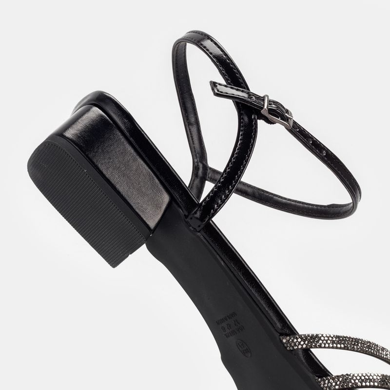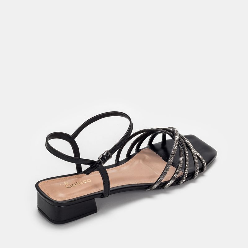 Sandália com salto blocado baixo, frente quadrada, tira finas com strass e tornozeleira ajustável em...