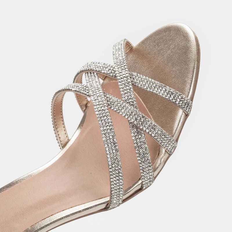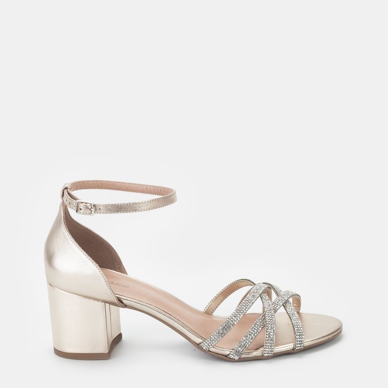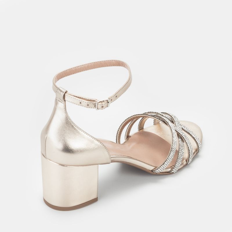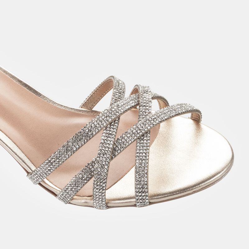 Sandália com salto médio e blocado, tiras cruzadas com strass, tornozeleira ajustável em fivela Sin...