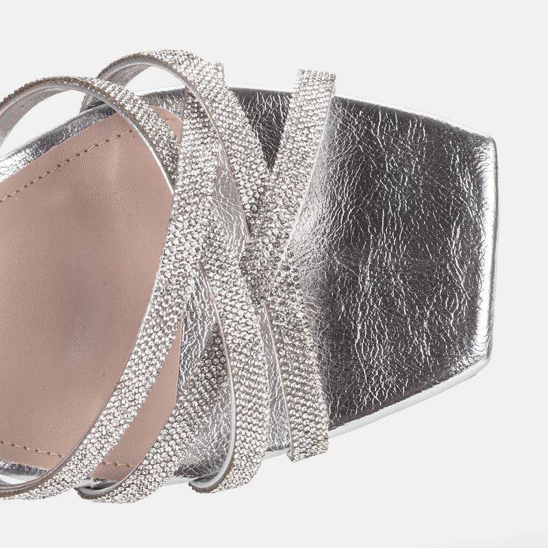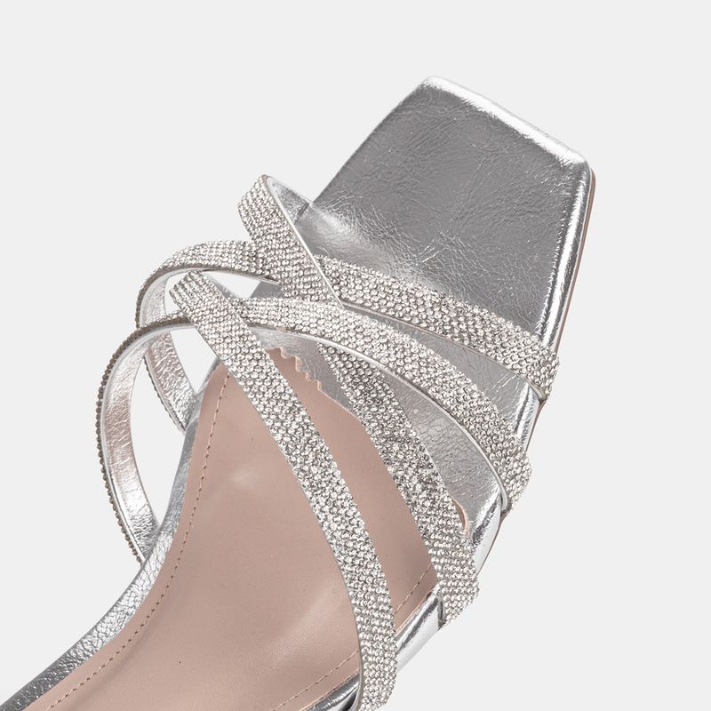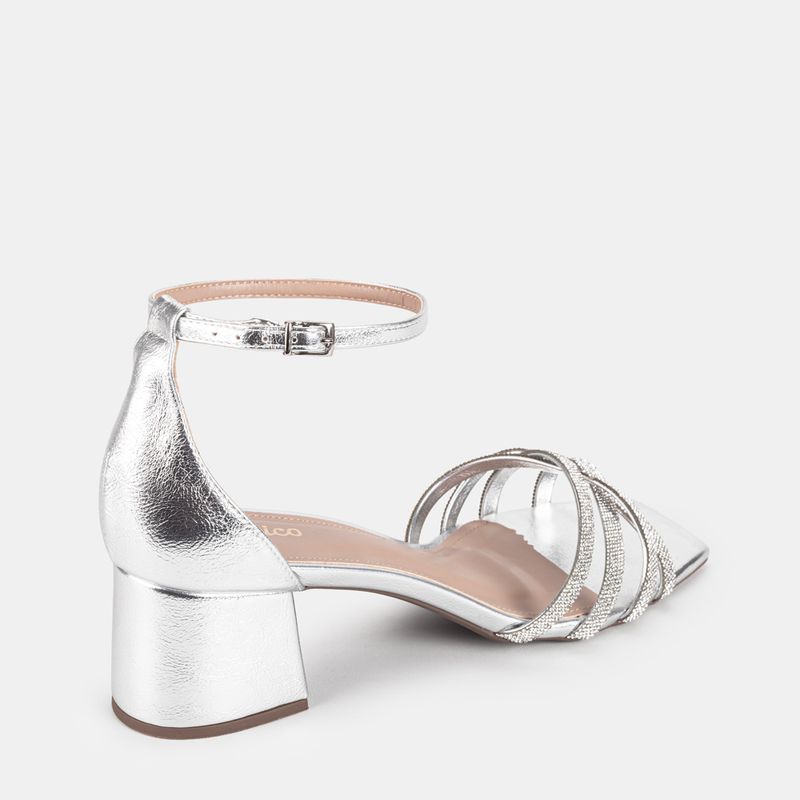 Sandália com salto blocado médio, frente quadrada, tiras finas com strass e traseira fechada com tor...