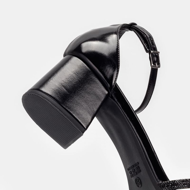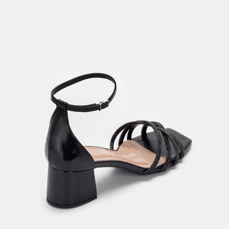 Sandália com salto médio e blocado, bico quadrado. tiras cruzadas com strass, tornozeleira ajustável...