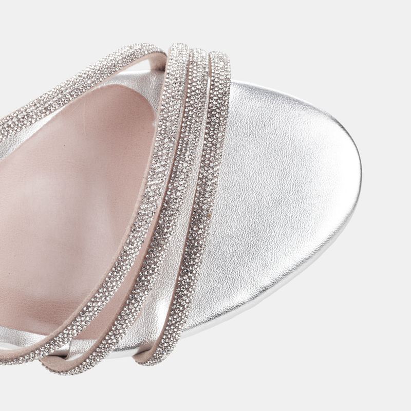 Sandália com salto fino, tiras finas com strass e bico redondo