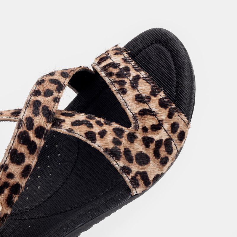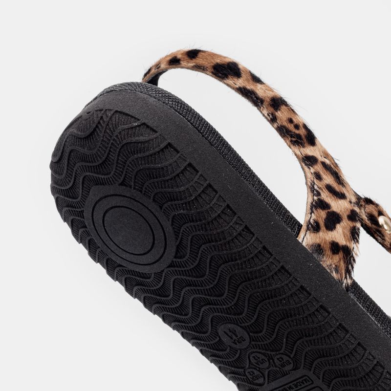 Sandália com tiras cruzadas sobre o peito do pé e elásticos laterais Couro macio animal print Altura...