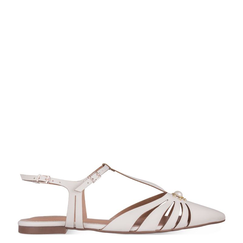 Sapatilha aberta bico fino, tira com fechamento em fivela, tira na vertical na frente, com detalhes ...