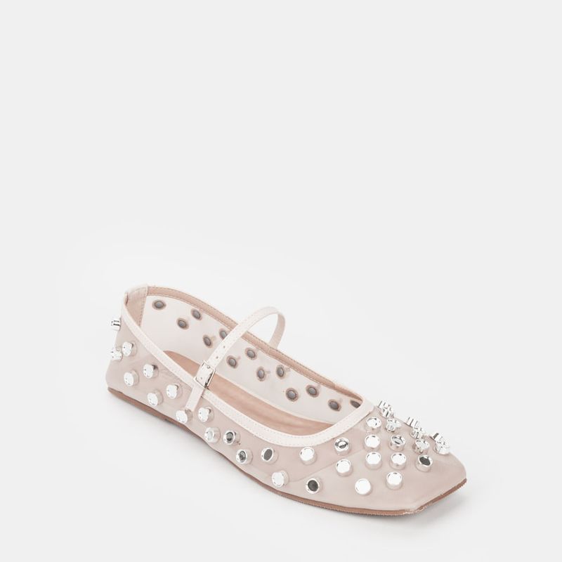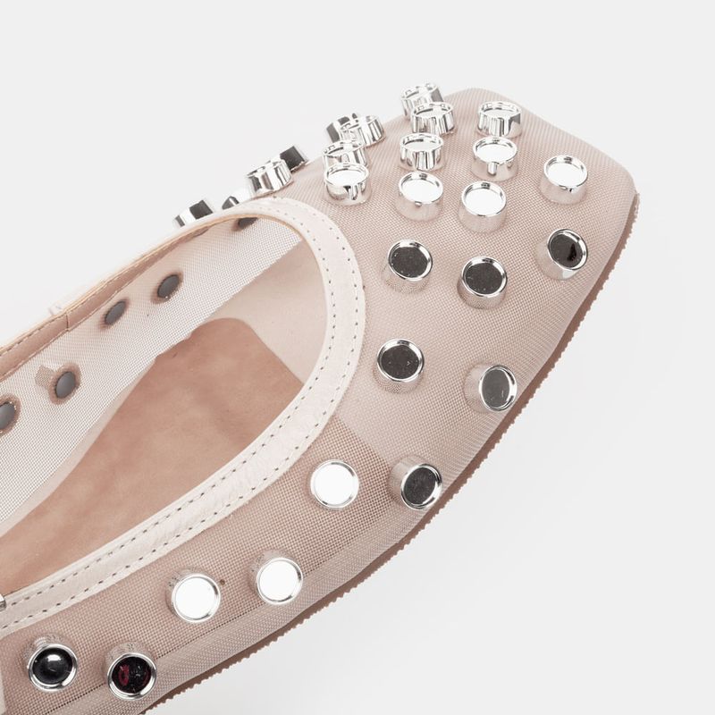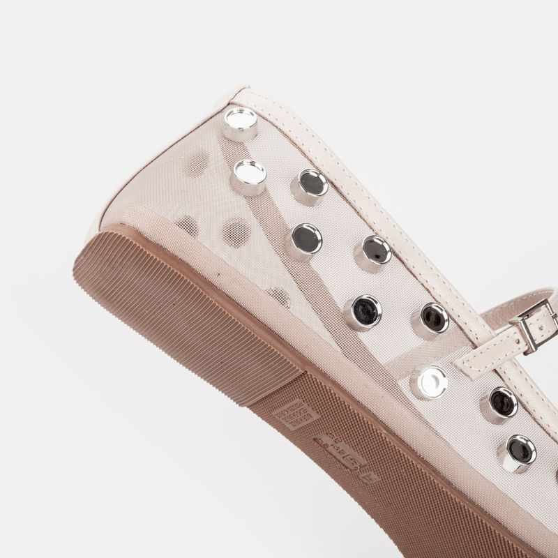 Sapatilha em tecido com transparencia, enfeites prata e tira com fivela sob o peito do pé Sintético...
