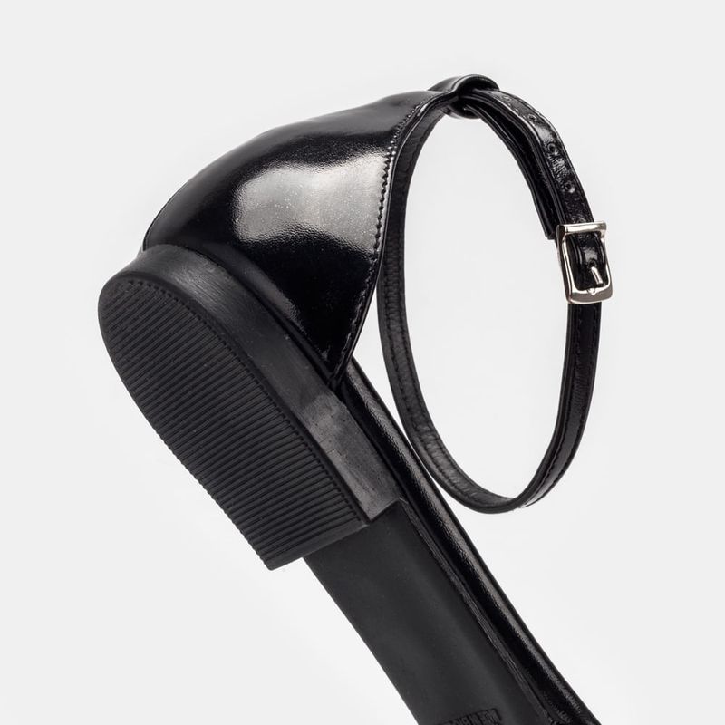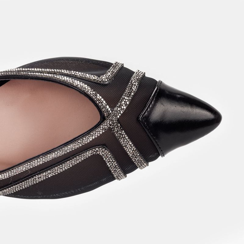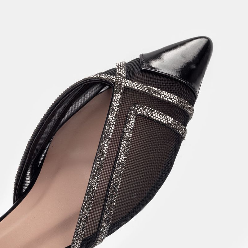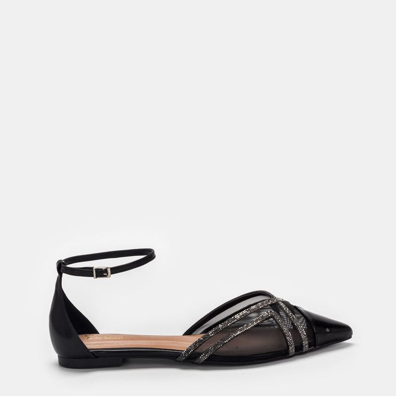Sapatilha com traseira fechada, com bico fino e detalhes em strass e tira no tornozelo com fechament...