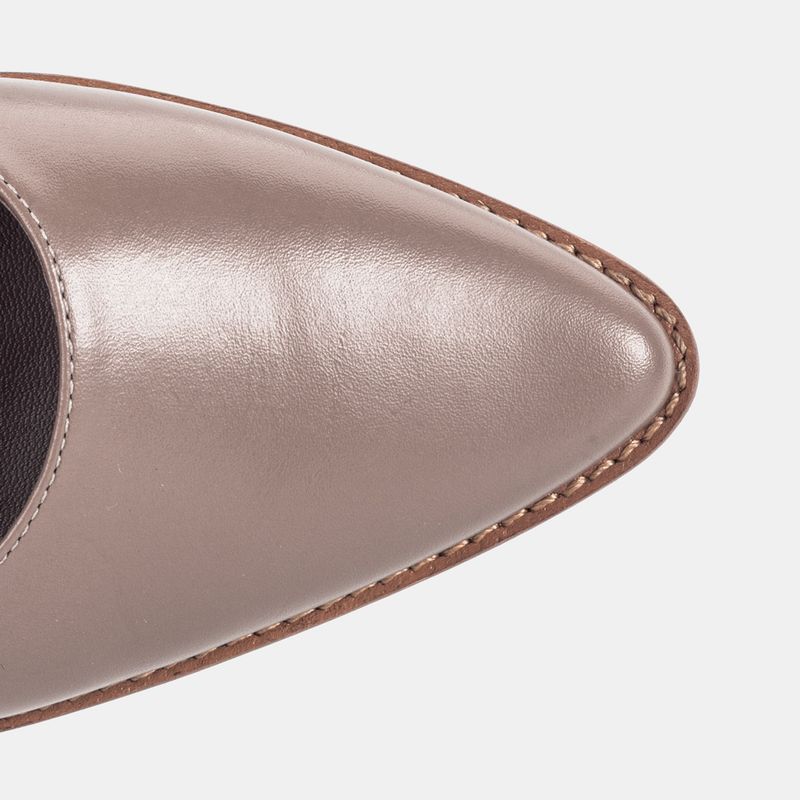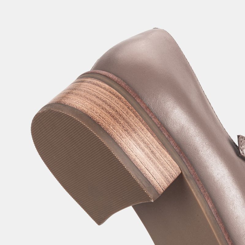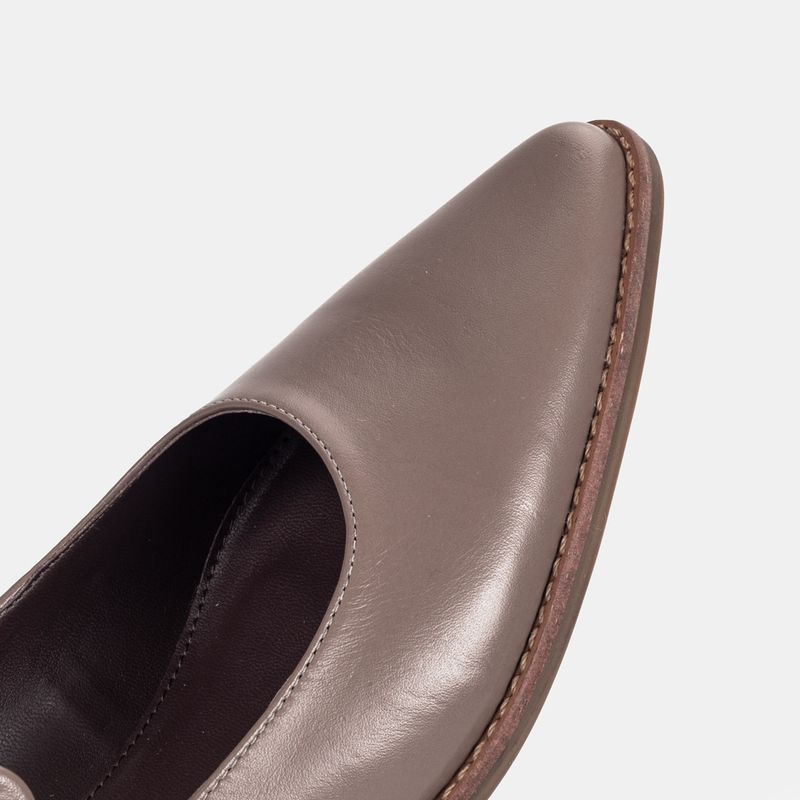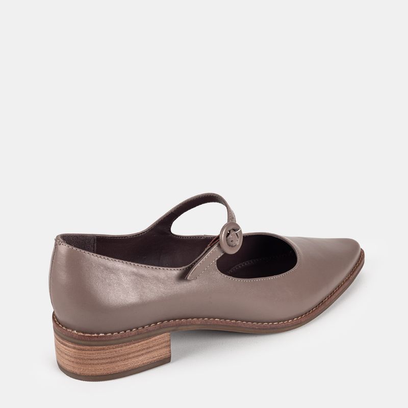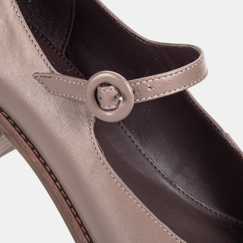 Sapato boneca com salto baixo, bico fino e tira ajustável em fivela sobre o peito do pé