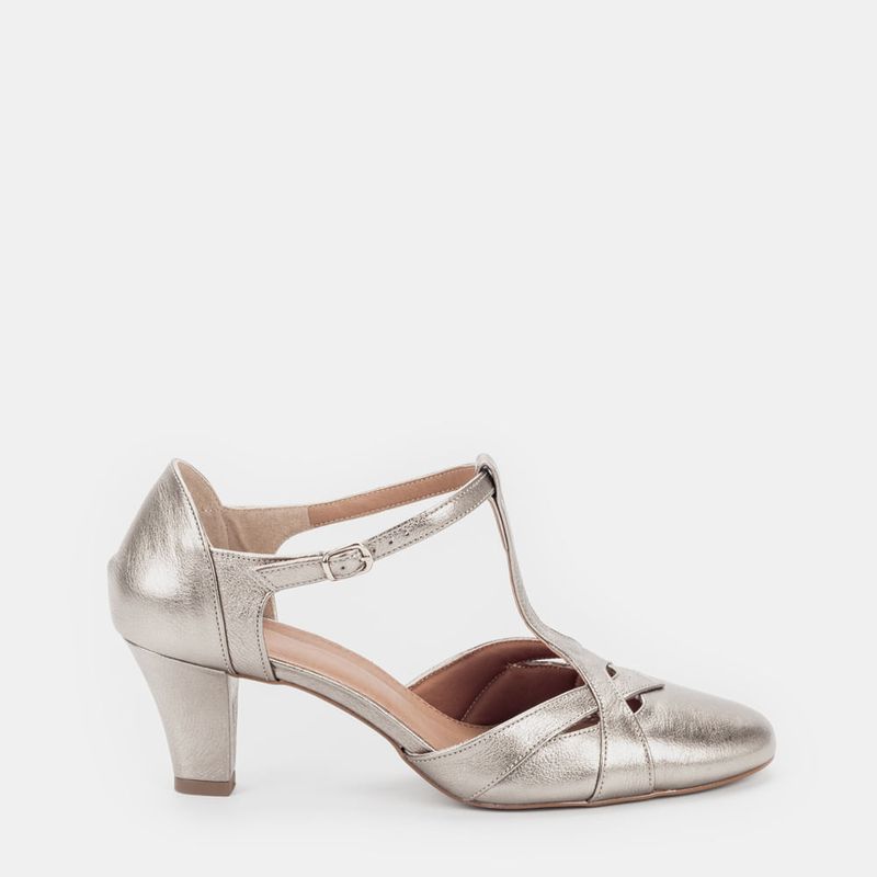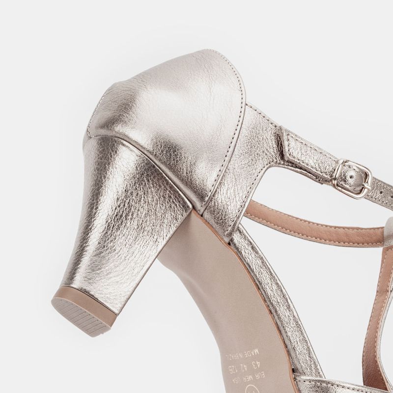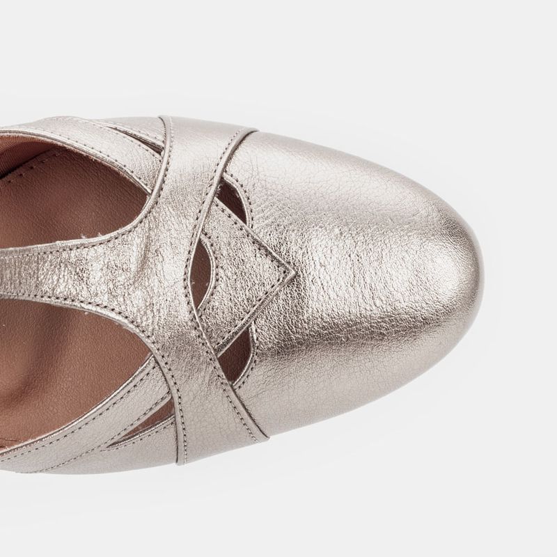Sapato boneca com salto médio grosso, bico redondo e tira cruzada ajustável em fivela Couro prata ve...
