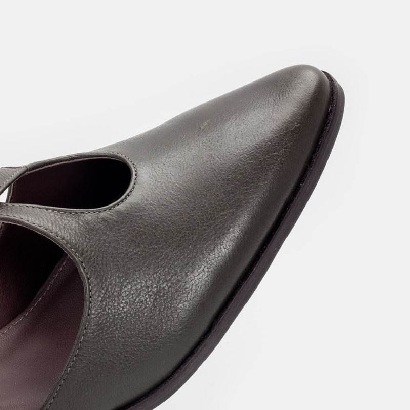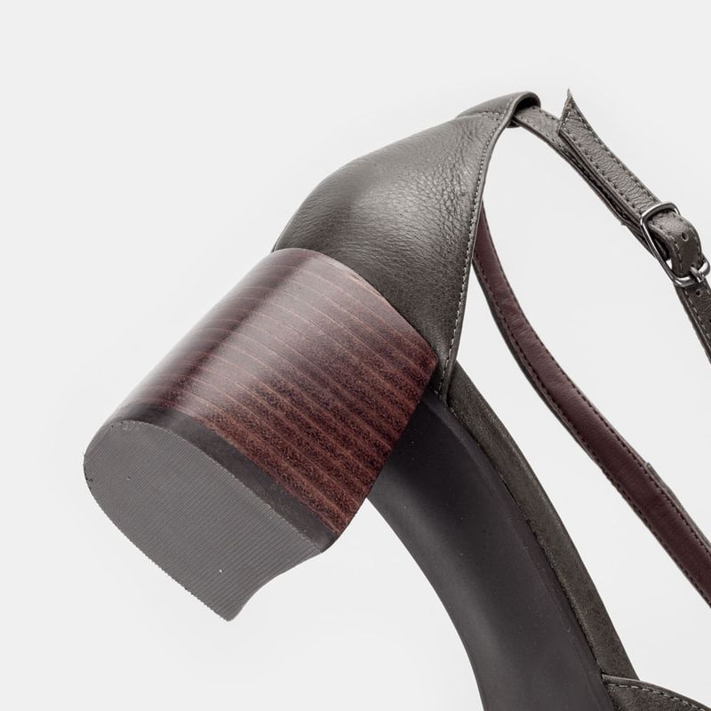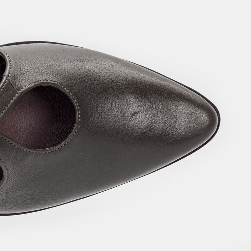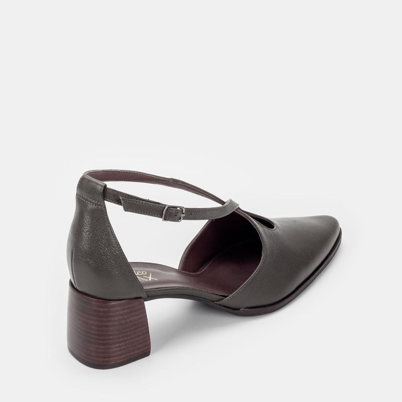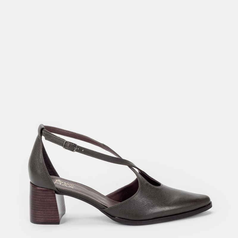 Scarpin com calcanhar e bico fechado, tira cruzada no peito do pé e fechamento em tira com fivela C...