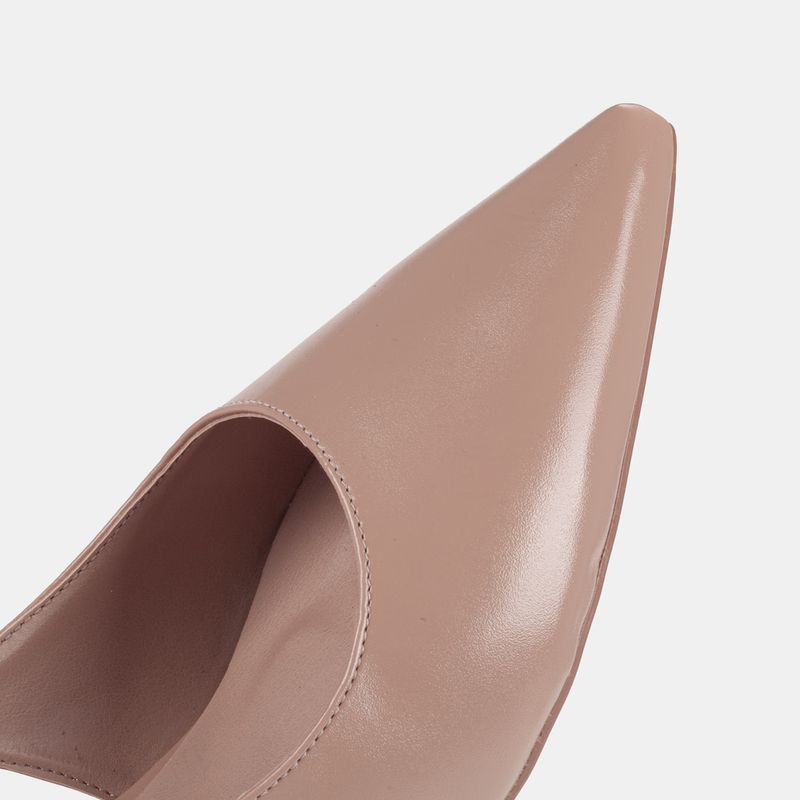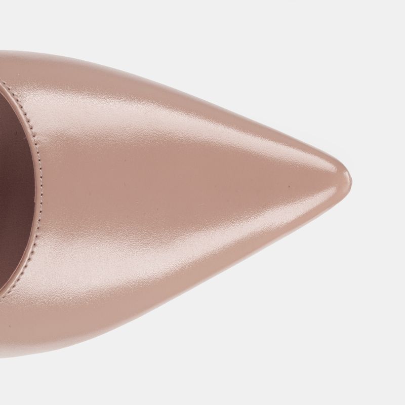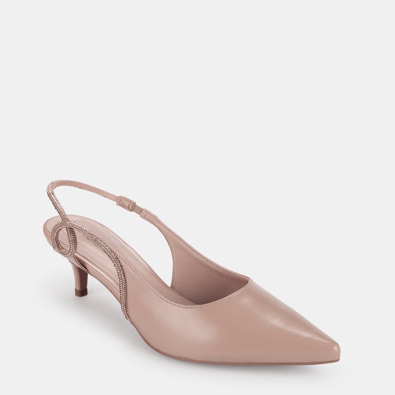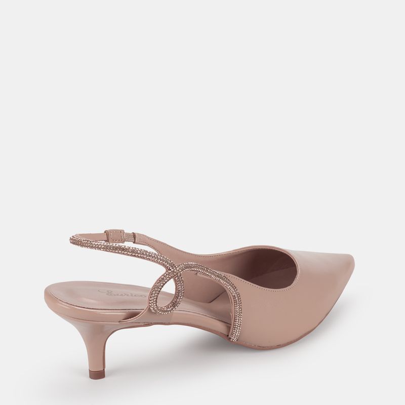 Scarpin chanel bico fino com tira de strass, detalhe circular na lateral, salto baixo fino e tira co...