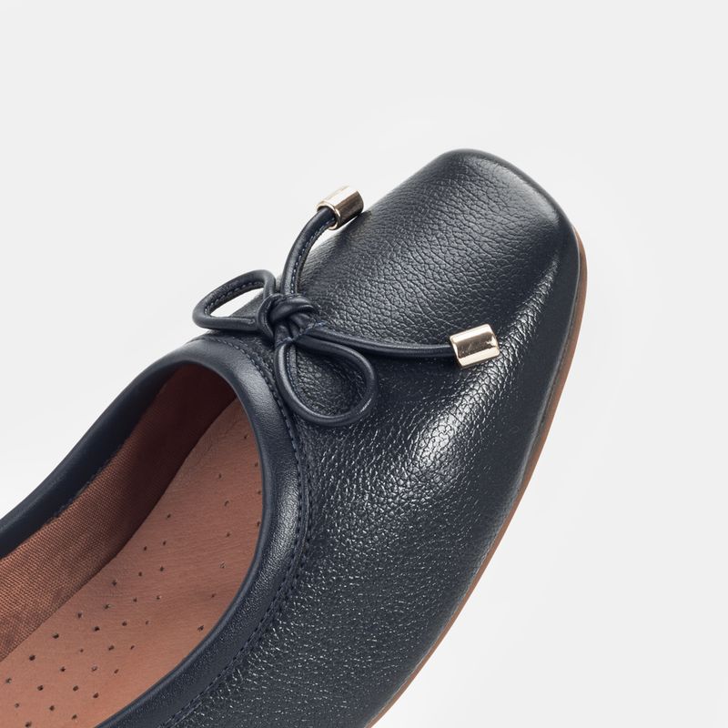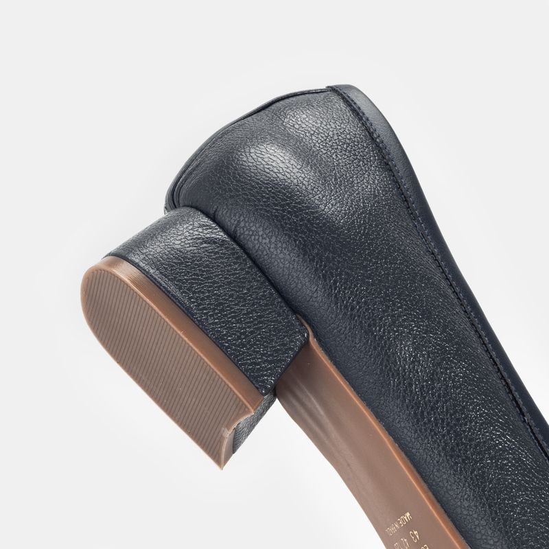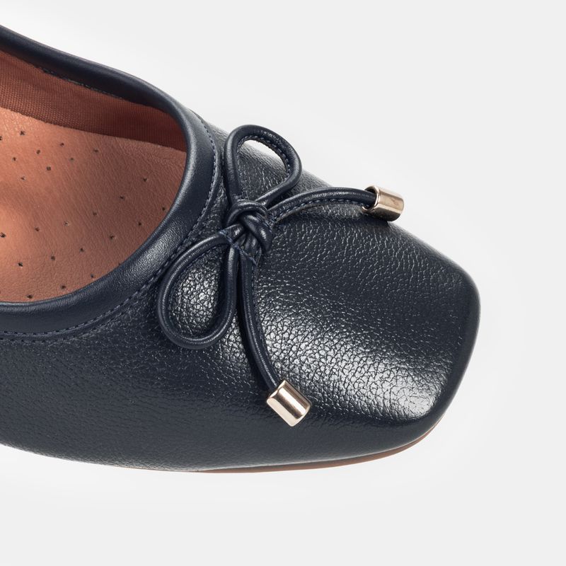 Scarpin com salto baixo e blocado, bico quadrado e laço frontal Couro macio marinho Salto 3 cm Fo...
