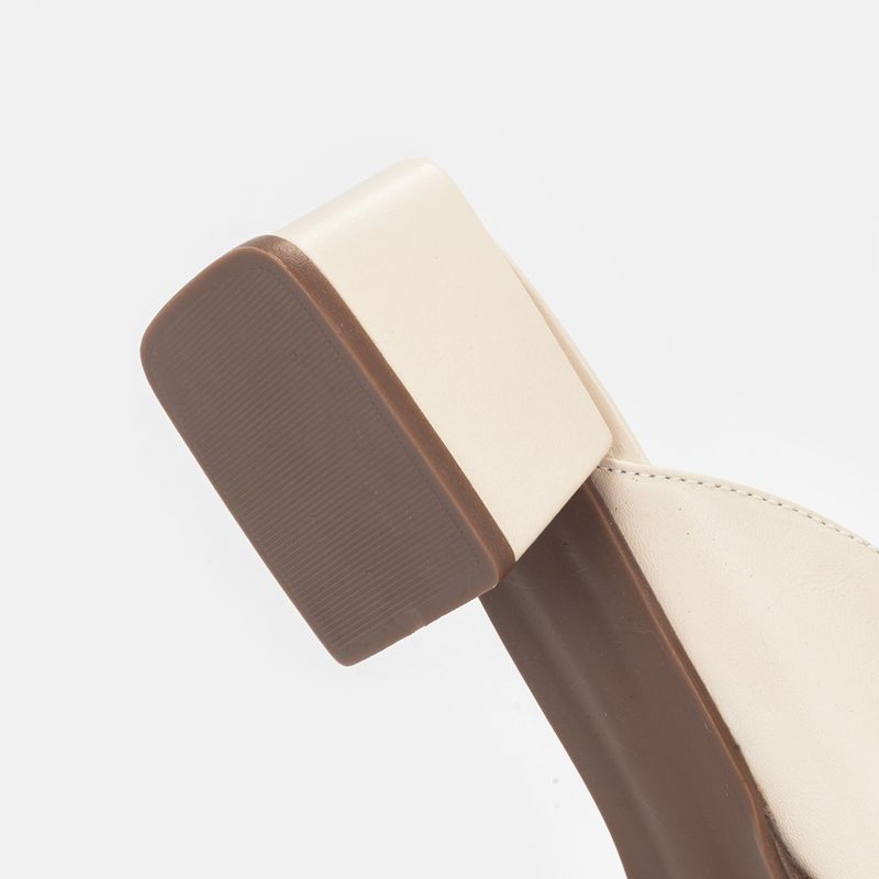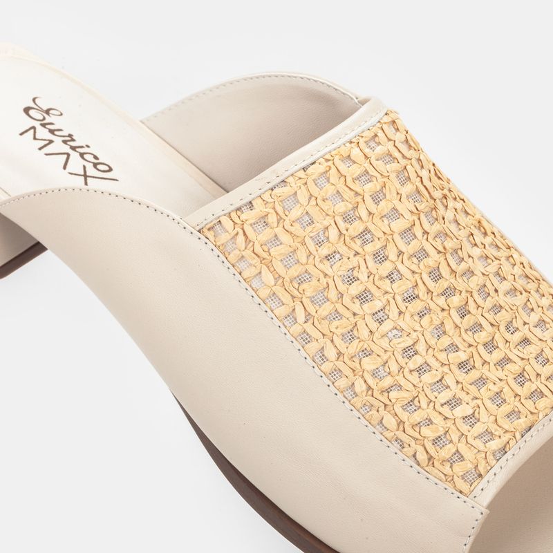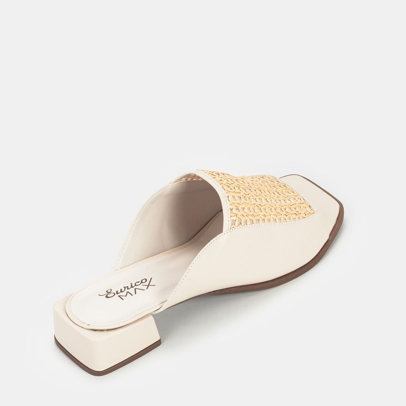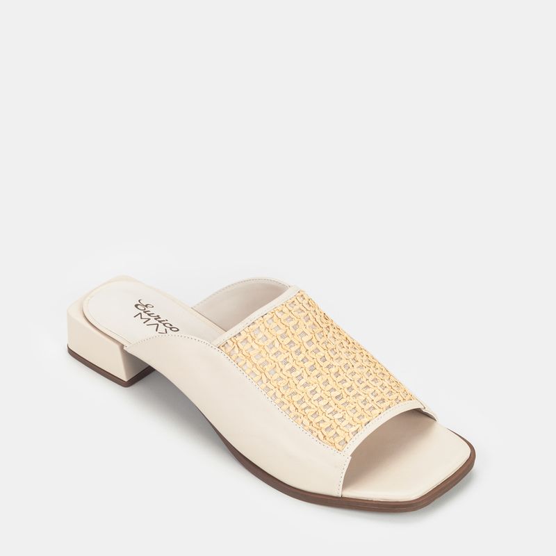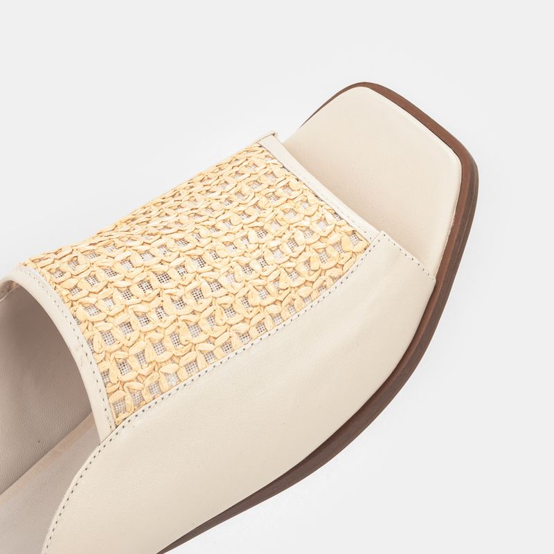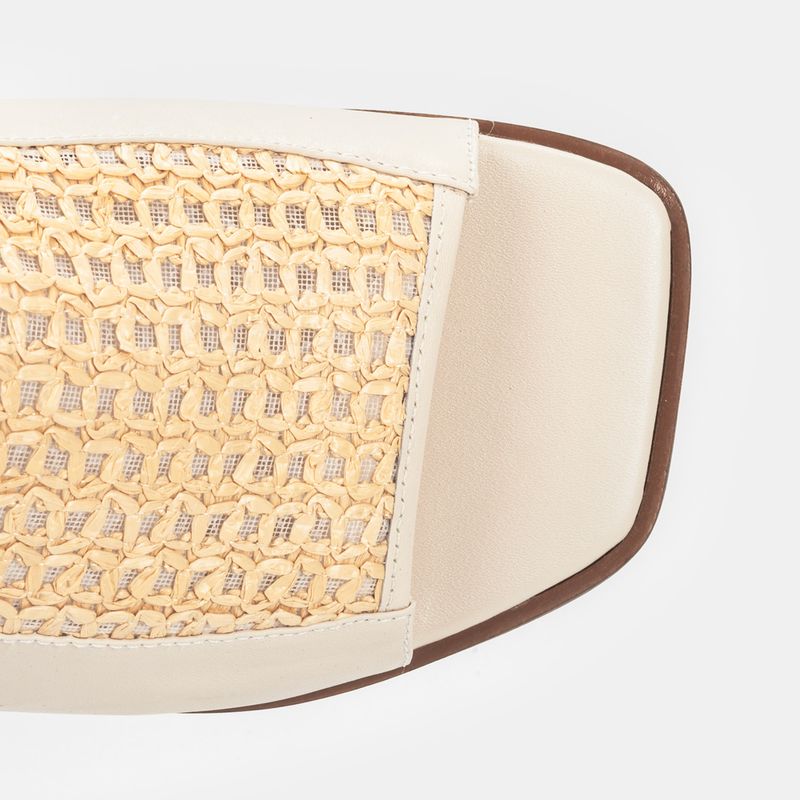 Tamanco com detalhes em ráfia, salto blocado e bico quadrado Couro off-white Salto 3 cm Palmilha for...