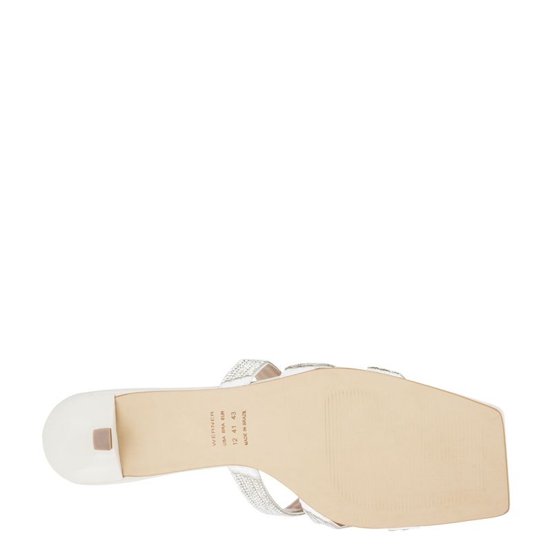 Tamanco com salto baixo, bico quadrado e tira curvada com strass incolor Sintético off-white Salto...