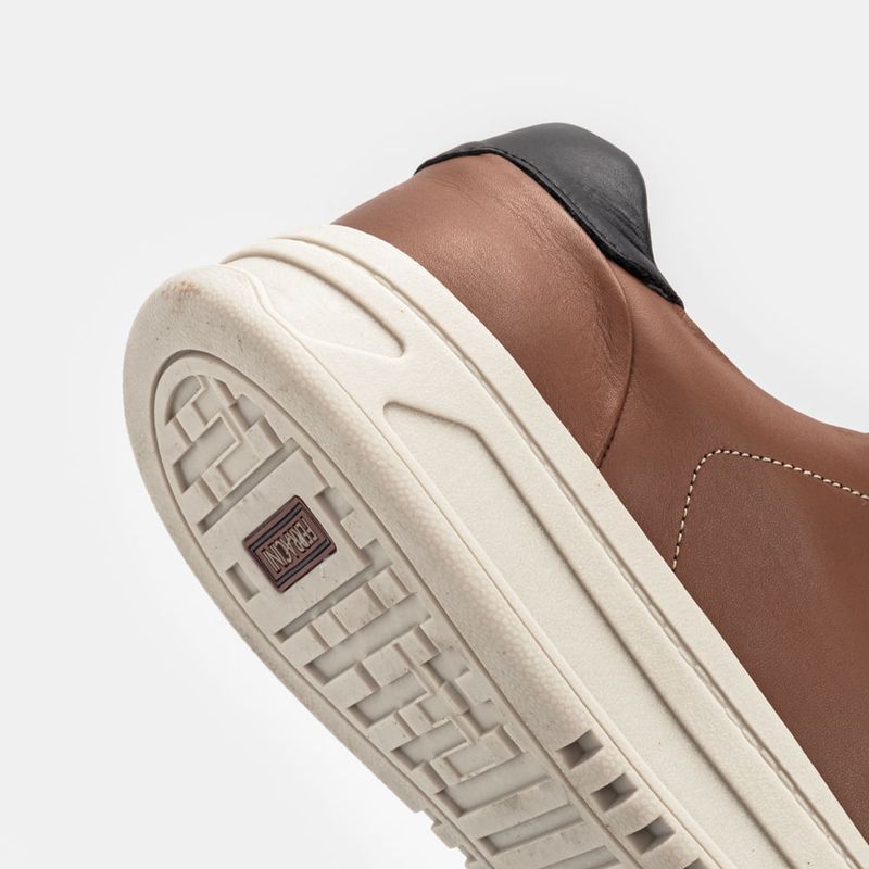 Tênis casual com acabamento pespontado, solado alto e fechamento em cadarço Couro macio marrom Det...