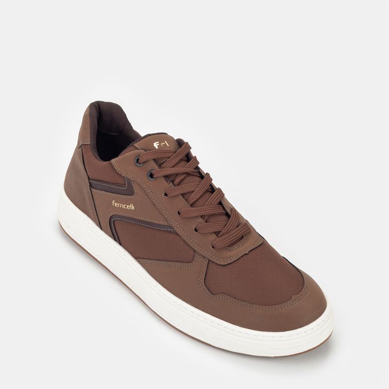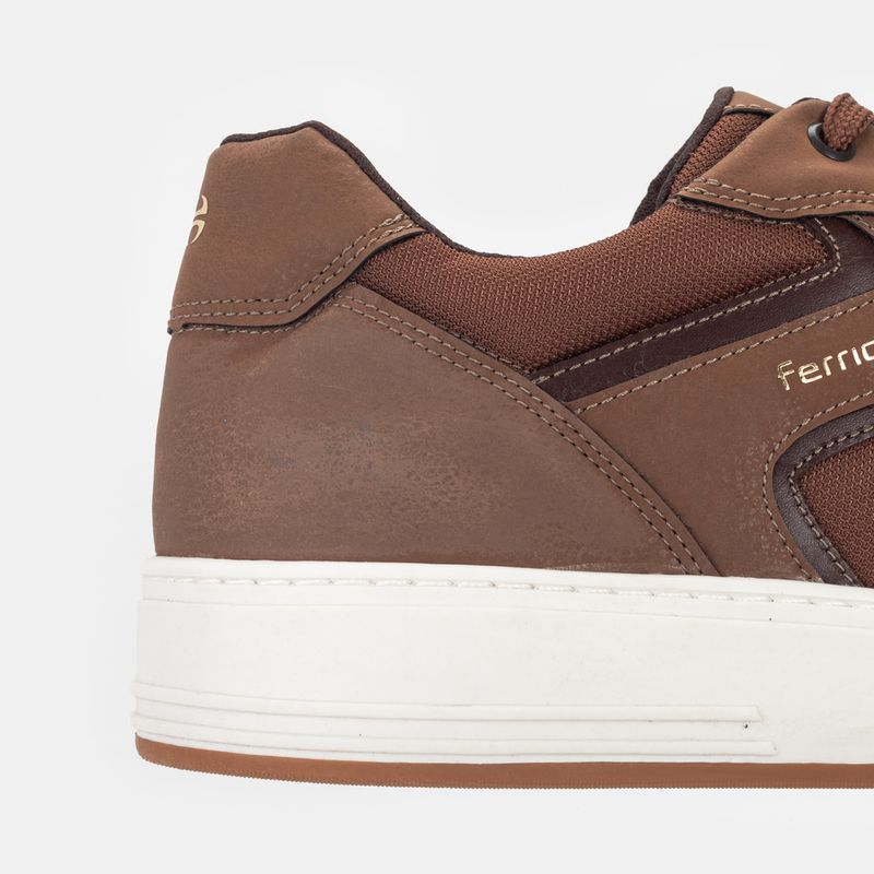 Tênis casual com fechamento em cadarço Nobuck e mesh marrom Forro em tecido com gola levemente aco...